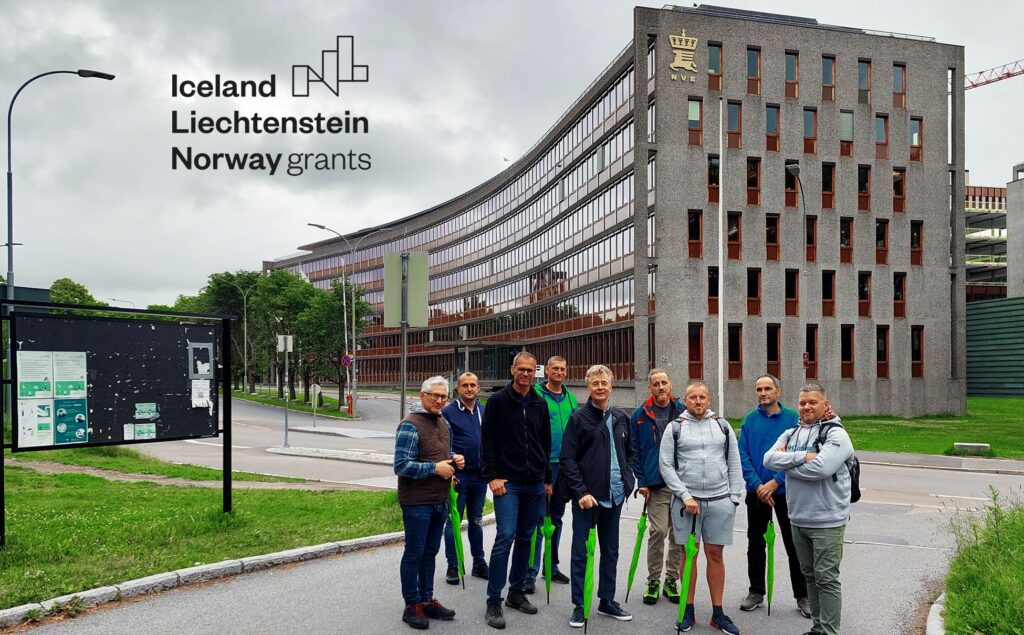 Czechowicka delegacja przed siedzibą NVE przy Middelthuns gate w Oslo. Norweska Dyrekcja ds. Zasobów Wodnych i Energii jest operatorem programu po stronie norweskiej. Instytucja ponadto sprawuje nadzór nad norweską gospodarką i energetyką wodną. Norwegia od lat prężnie rozwija się w obszarze energetyki wodnej i dysponuje olbrzymim, bo szacowanym na 213 TWh/rok technicznym potencjałem hydroenergetycznym. Blisko 98 procent energii w norweskim systemie elektroenergetycznym pochodzi ze źródeł odnawialnych, w tym aż 96% z energetyki wodnej (źródło: https://www.gov.pl/web/klimat/) | fot. PM, CEE/UM